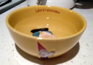 Naturally, my curiosity got the better of me. I put the lil’ bugga in some water. The water was contained in a yellow gnome bowl. Naturally.